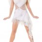 Features an asymmetrical dress with underwire and remove bra pads in the lining, feather wings, and a jeweled marabou halo.