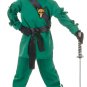 Matching green shirt, pants, sash, belt, mask, and hood.
